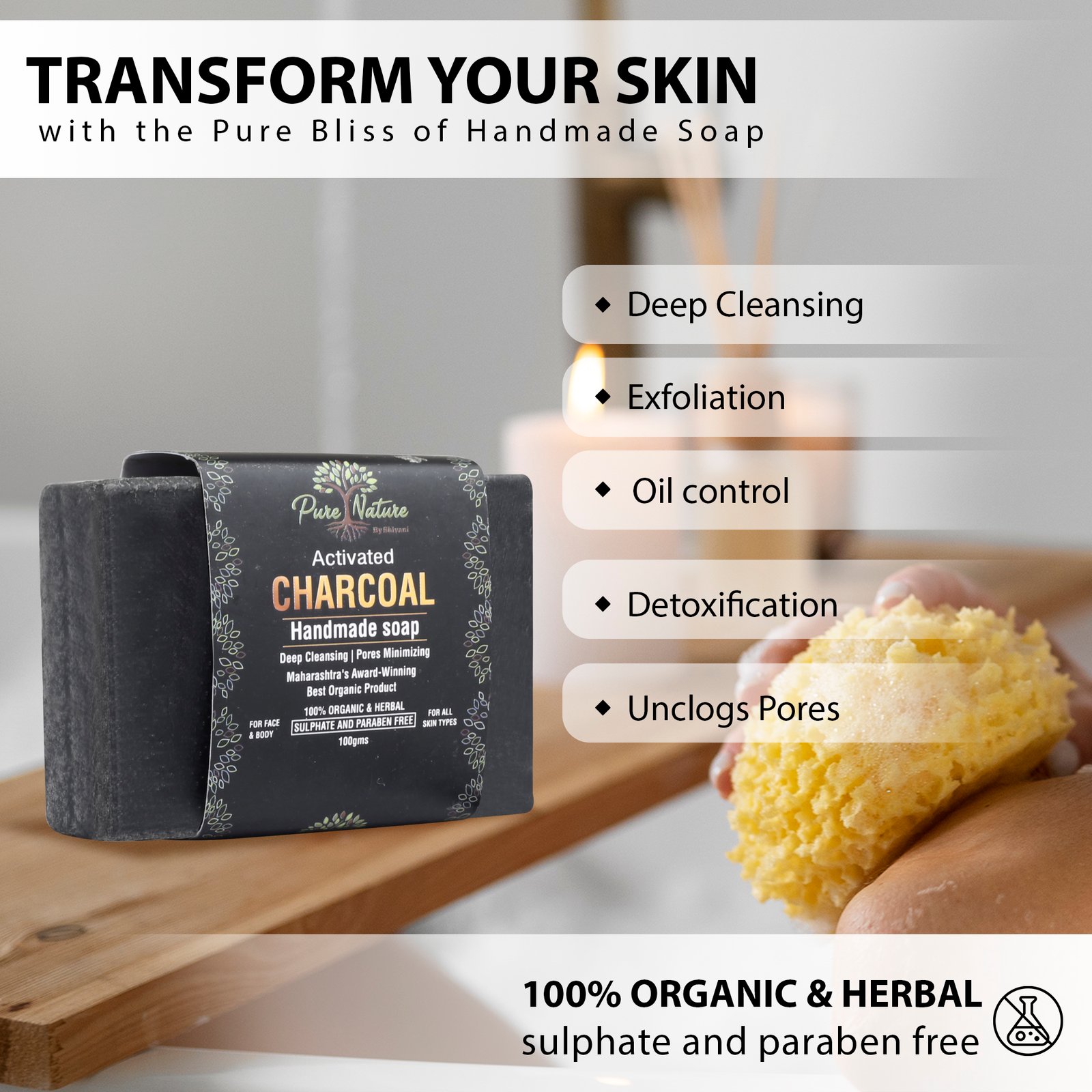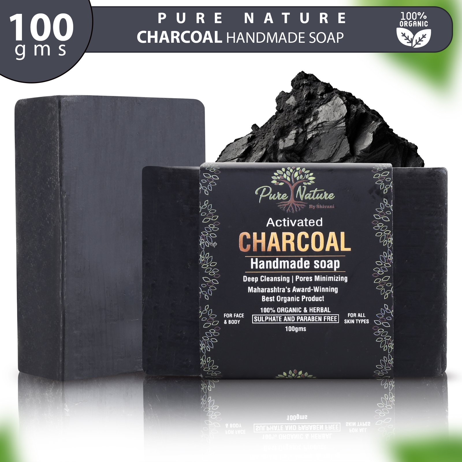 A 100% organic handmade charcoal soap that provides deep cleansing, detoxification, oil control, and exfoliation for healthy, clear skin.