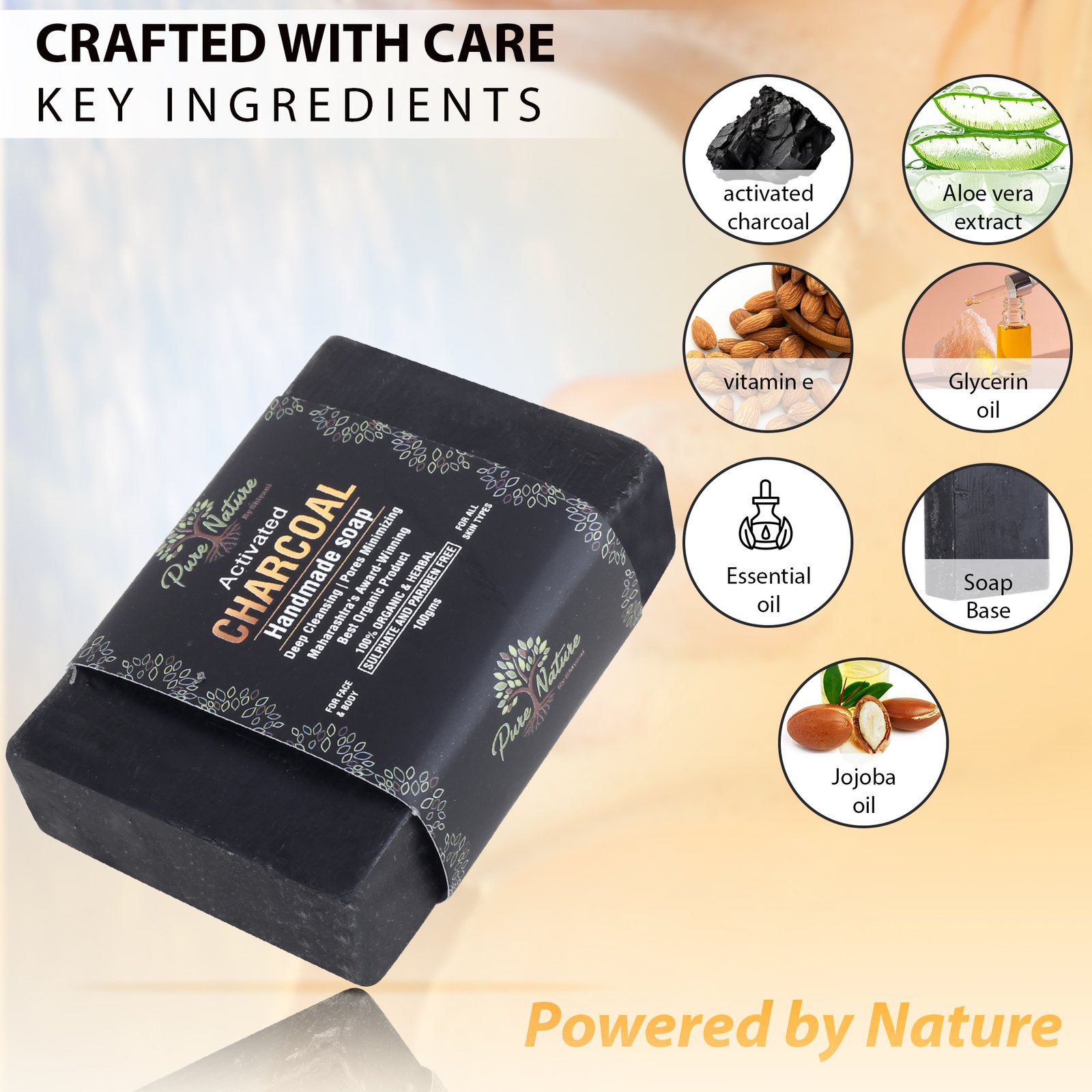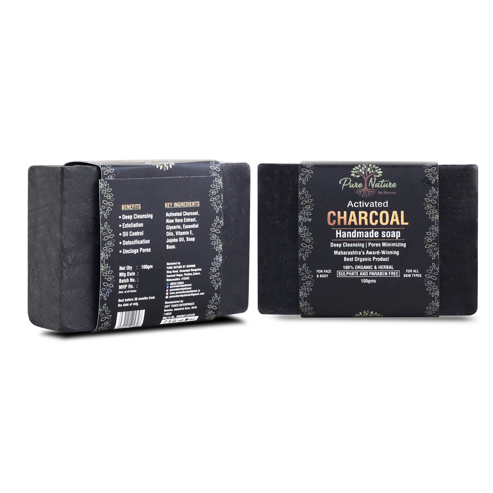 Pure Nature Activated Charcoal Handmade Soap is a 100% organic and herbal cleansing bar formulated with Activated Charcoal, Aloe Vera Extract, Jojoba Oil, Glycerin, Vitamin E, and Essential Oils. Free from sulphates and parabens, it works as a deep cleanser, drawing out dirt, oil, and toxins from the skin while unclogging pores. Its natural exfoliating properties help in removing dead skin cells, while oil-control and detoxifying benefits make it especially effective for oily and acne-prone skin. Regular use leaves the skin smooth, refreshed, and rejuvenated. Suitable for all skin types, it can be used on both face and body.