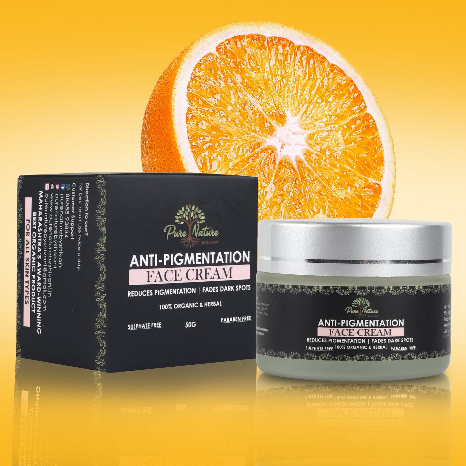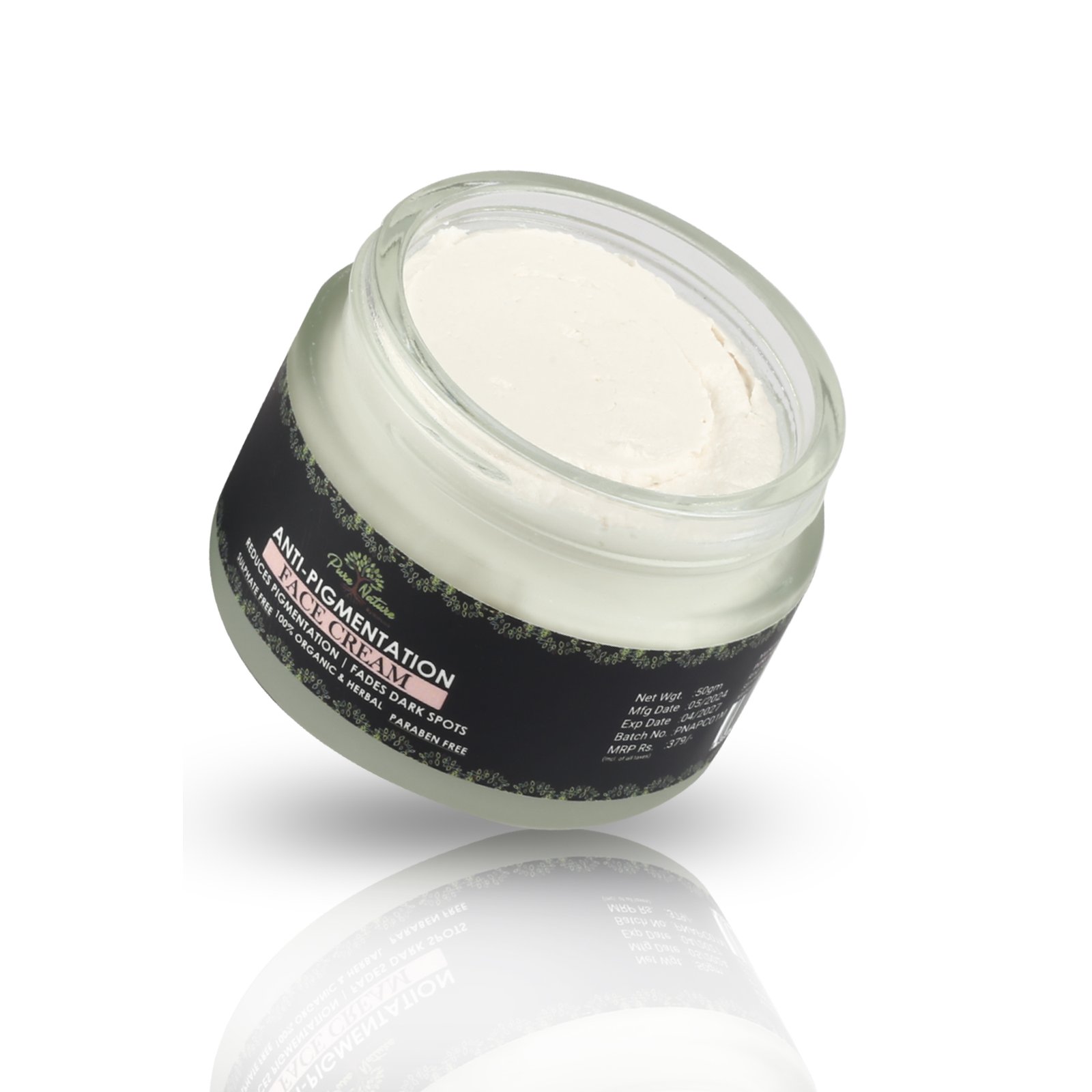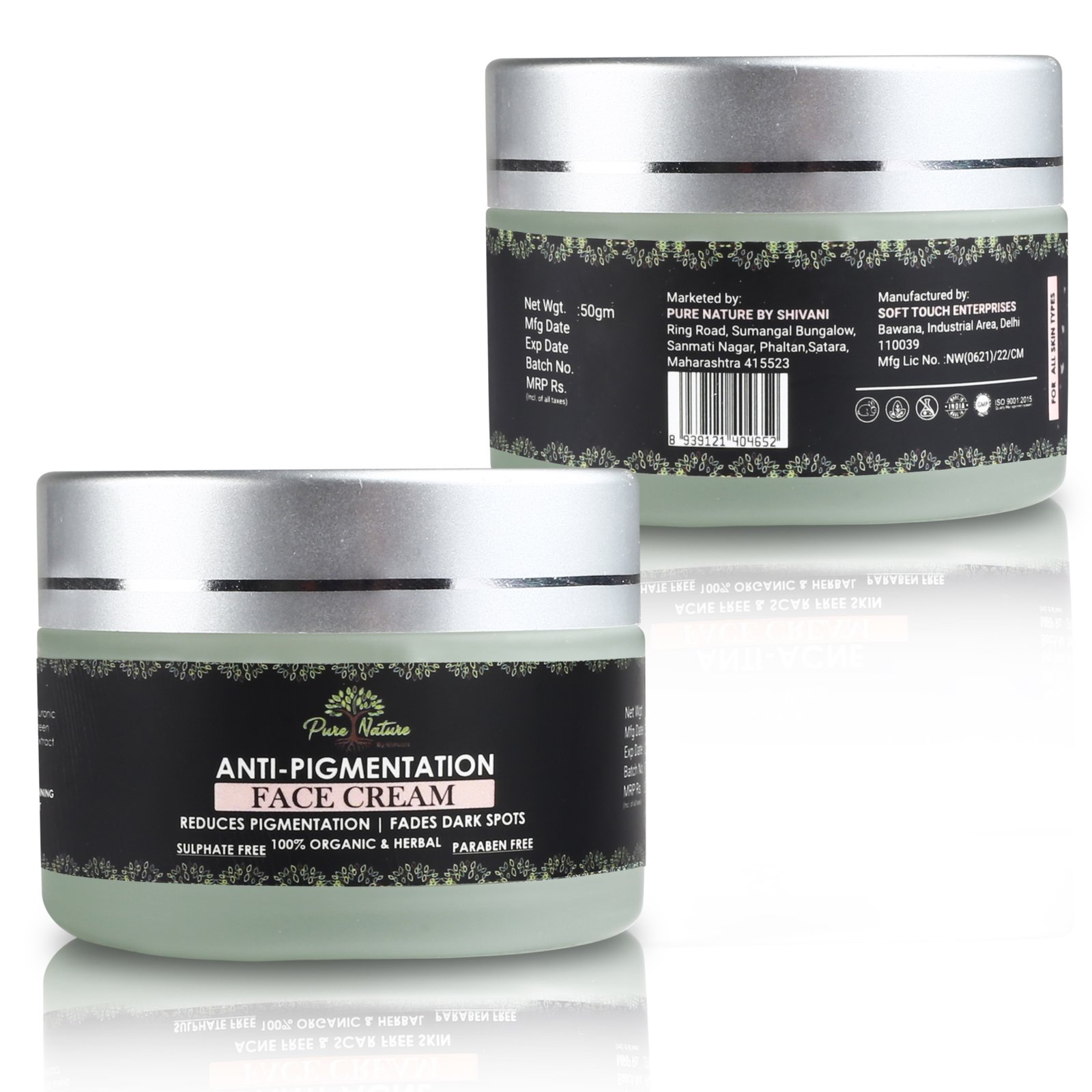 Pure Nature Anti-Pigmentation Face Cream is a 100% organic and herbal solution to fight pigmentation, fade dark spots, and restore an even-toned, glowing complexion. Enriched with Vitamin C, Green Tea Extract, Neem Extract, and Glycerin, this cream works to brighten the skin, reduce hyperpigmentation, and improve overall skin texture. Its lightweight, non-greasy formula penetrates deep into the skin, targeting discoloration, evening out skin tone, and boosting skin health. With daily use, it helps reveal a radiant, smooth, and youthful glow while being sulphate-free and paraben-free. Suitable for all skin types.