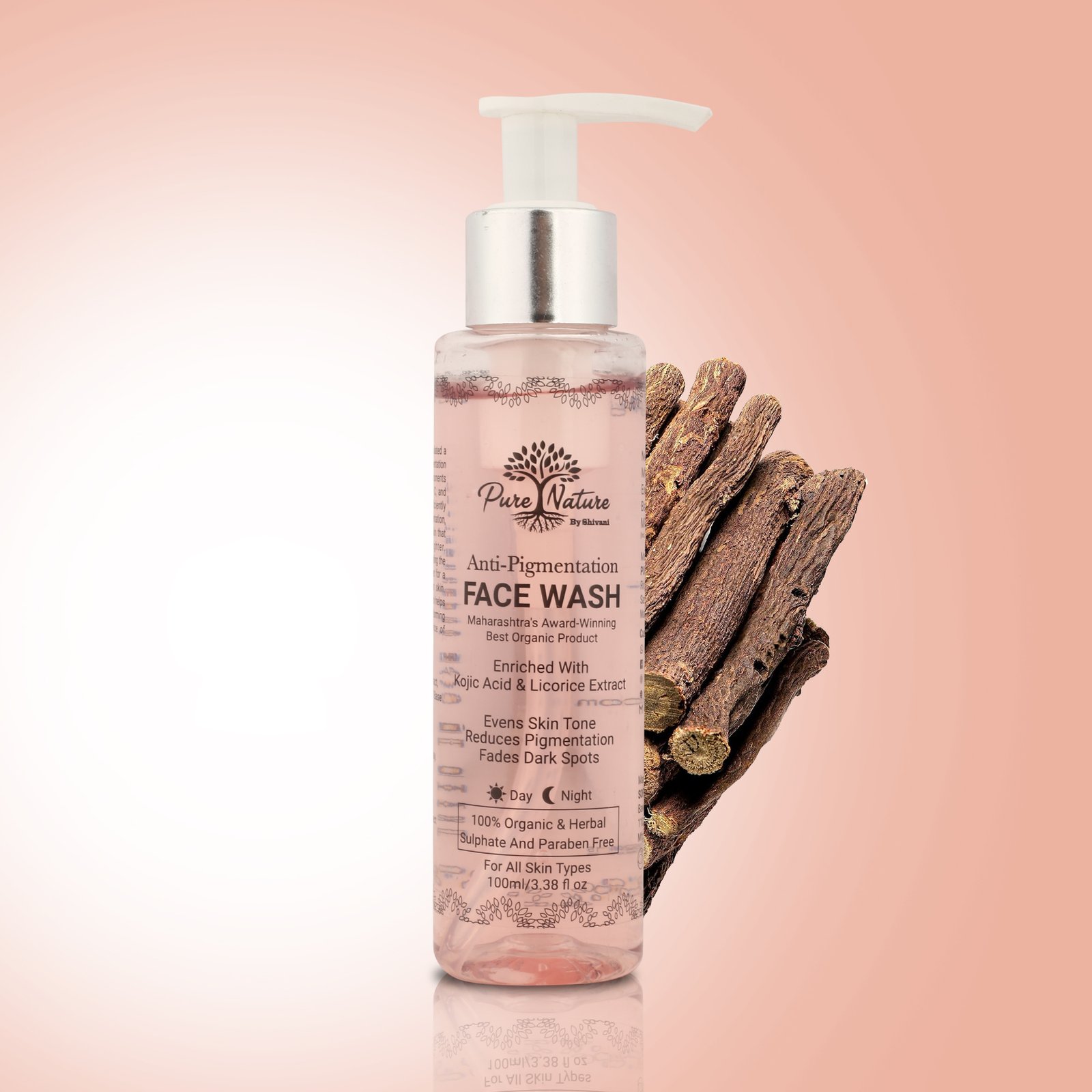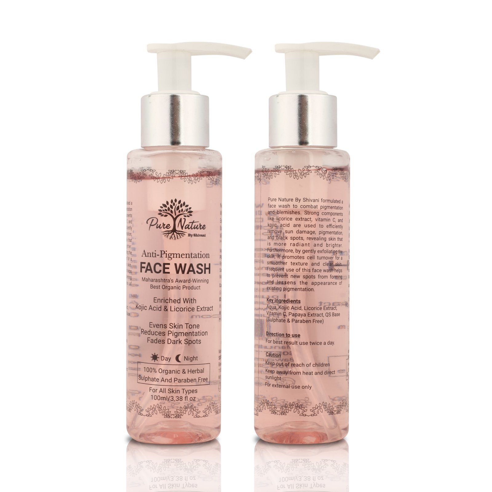 Pure Nature Anti-Pigmentation Face Wash is a 100% organic and herbal skin-brightening cleanser enriched with Kojic Acid, Licorice Extract, Green Tea Extract, and Aloe Vera. This gentle yet effective formula helps fade dark spots, reduce pigmentation, and even out skin tone while keeping the skin soft and hydrated. Free from sulphates and parabens, it provides intense hydration and antioxidant protection, leaving your skin radiant, refreshed, and smoother with regular use. Safe for all skin types, it can be used day and night for glowing, clear skin.How to Use: