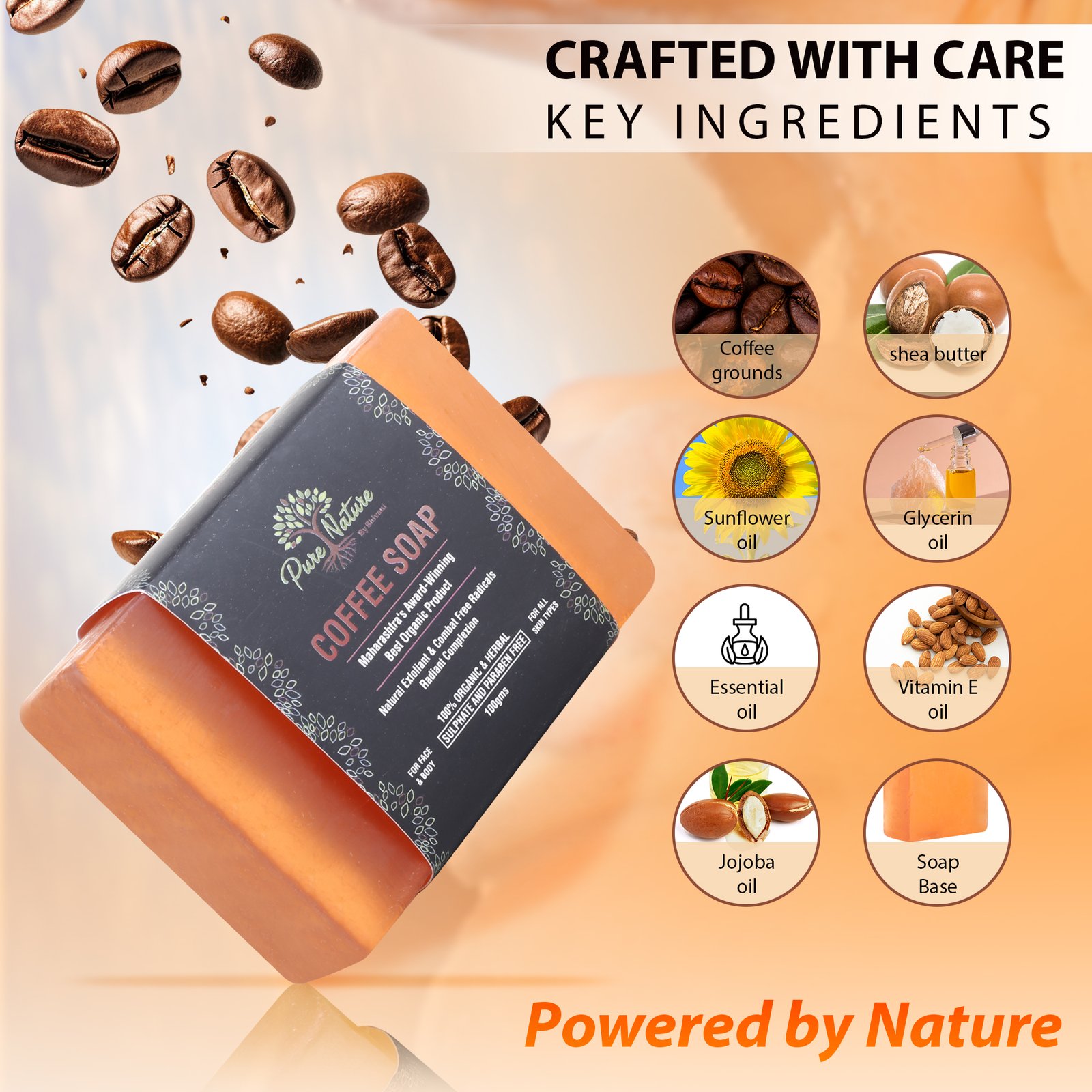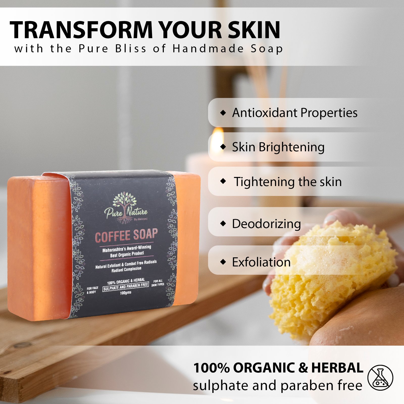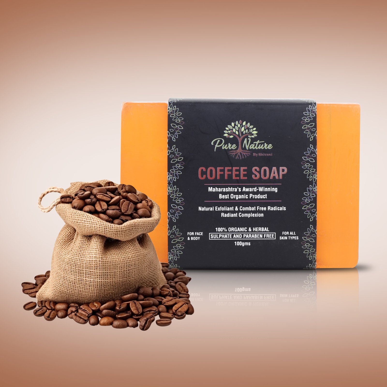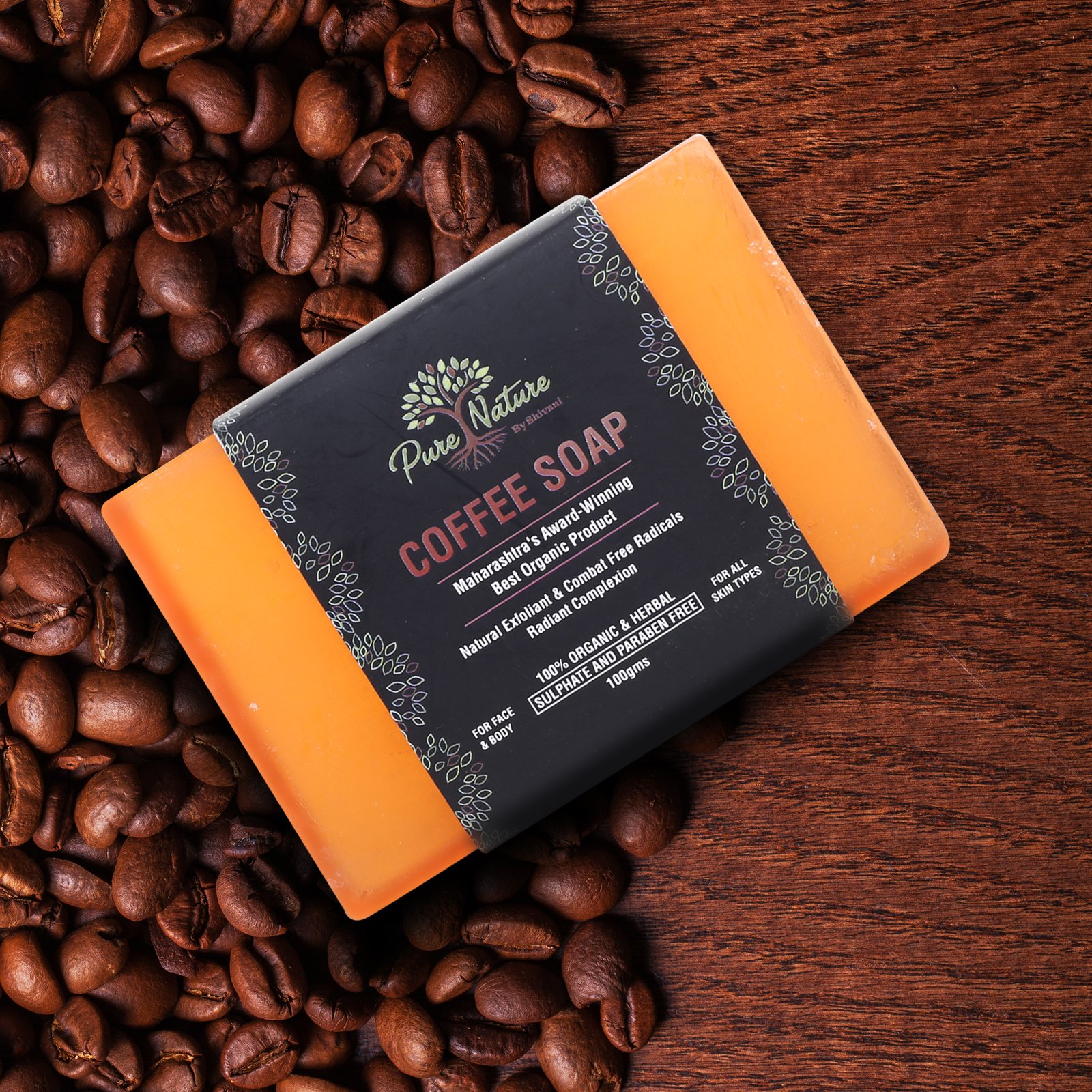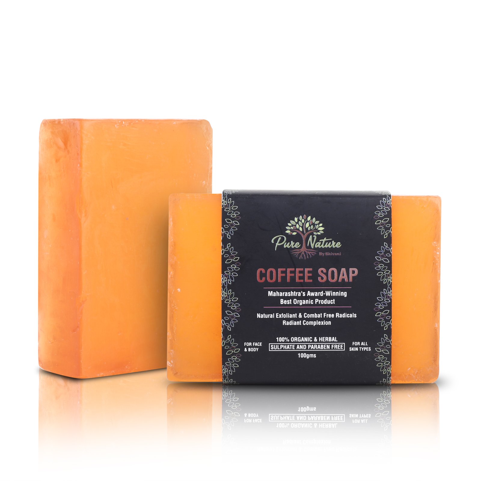 Pure Nature Coffee Handmade Soap is a 100% organic and herbal exfoliating bar enriched with Coffee Grounds, Shea Butter, Sunflower Oil, Jojoba Oil, Glycerin, Vitamin E, and Essential Oils. This sulphate-free and paraben-free soap gently removes dead skin cells, unclogs pores, and promotes a smoother complexion.